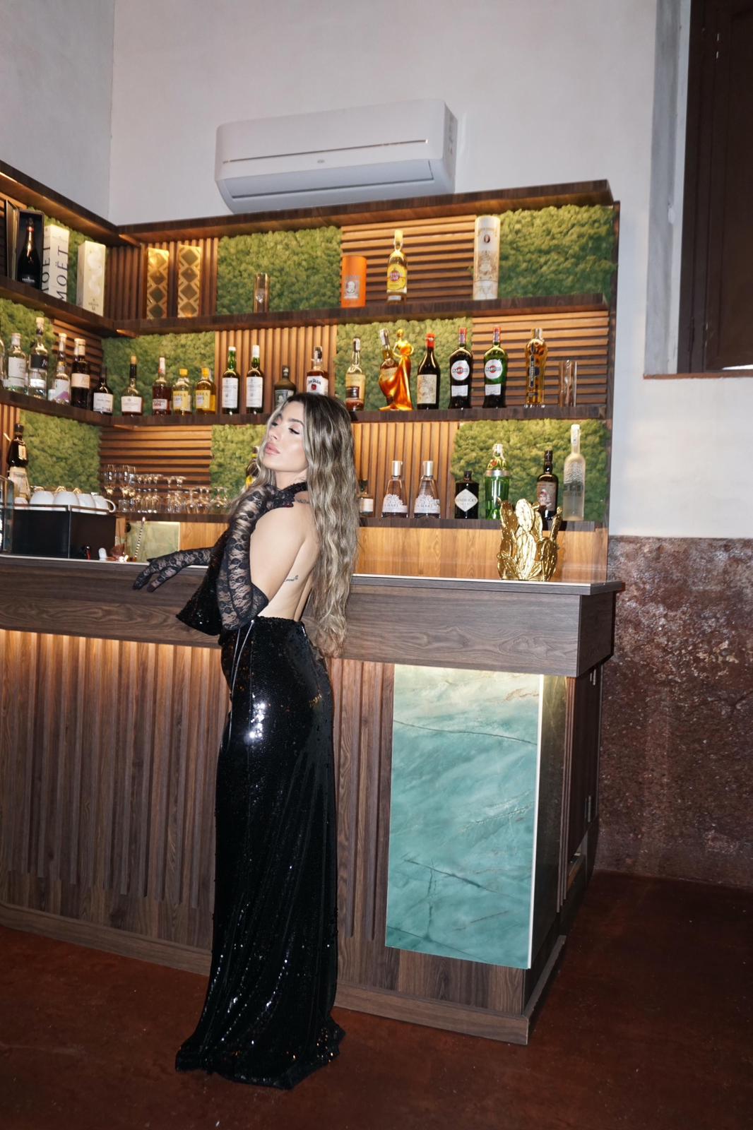 Abito lungo elegante in tessuto ricoperto di paillettes Nero, caratterizzato da una scollatura profonda a drappeggio che crea un effetto luminoso e sinuoso. Il taglio segue la linea del corpo senza essere eccessivamente aderente, valorizzando la figura con discreta raffinatezza. La superficie scintillante esalta il movimento e dona un tocco glamour ideale per serate ed ed eventi formali.