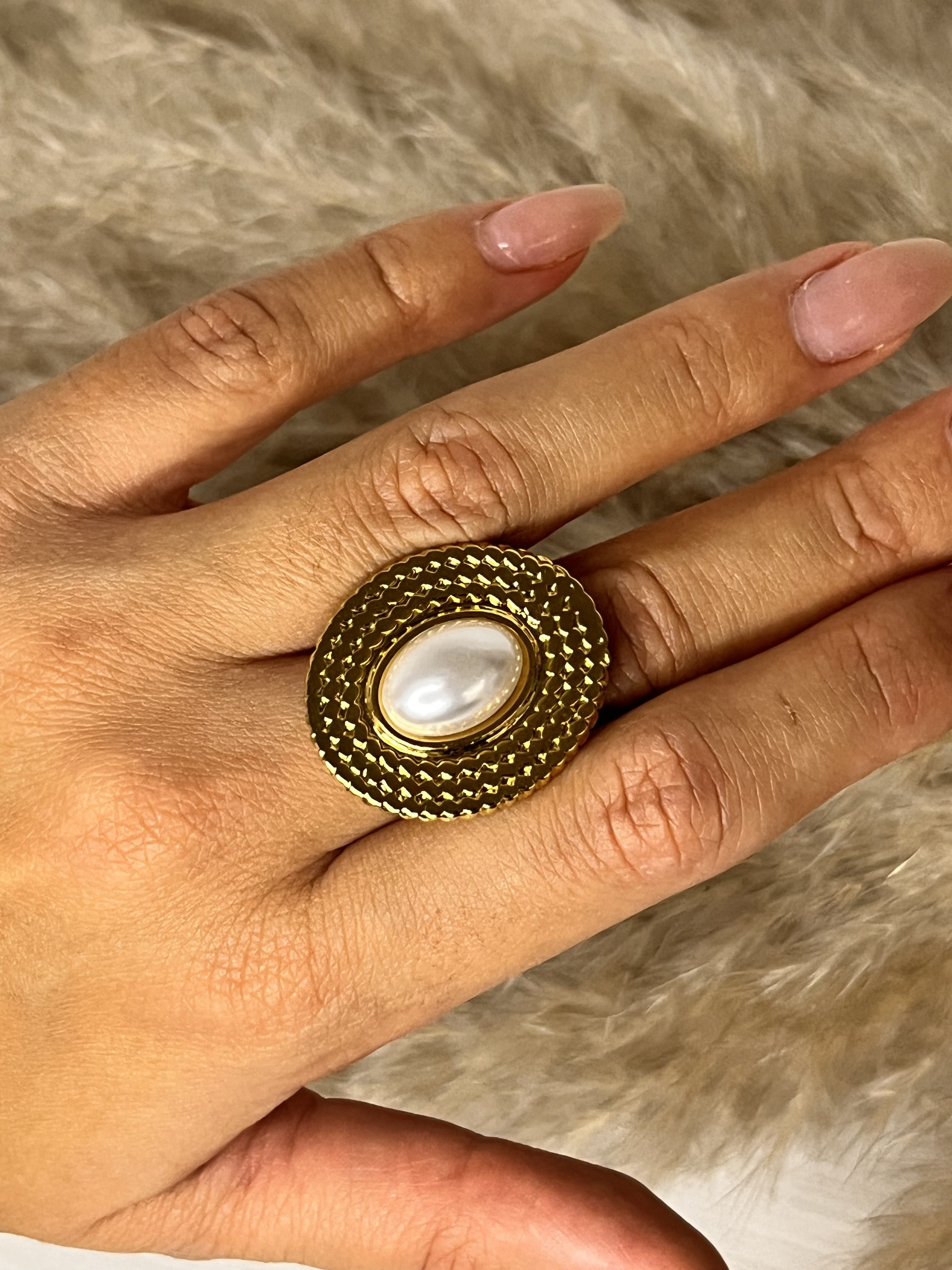 Questo anello statement è pensato per le ragazze che amano i gioielli dal forte impatto visivo. La base è un voluminoso cerchio color oro lucido, caratterizzato da una texture a rilievo finemente lavorata che ricorda la catena o l’intreccio. Al centro, risalta una gemma ovale effetto perla o madreperla che offre un contrasto morbido e raffinato con l’oro.
