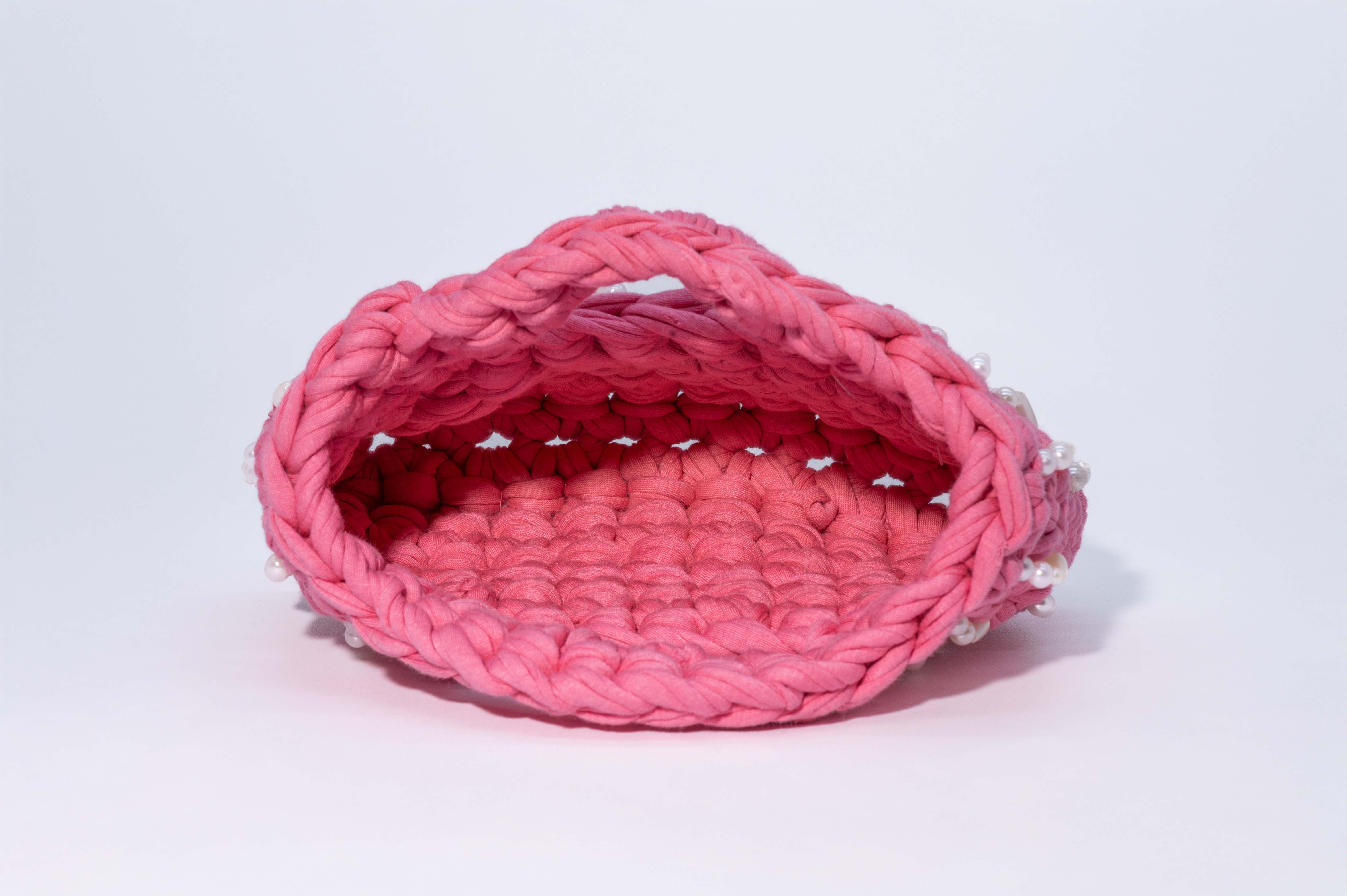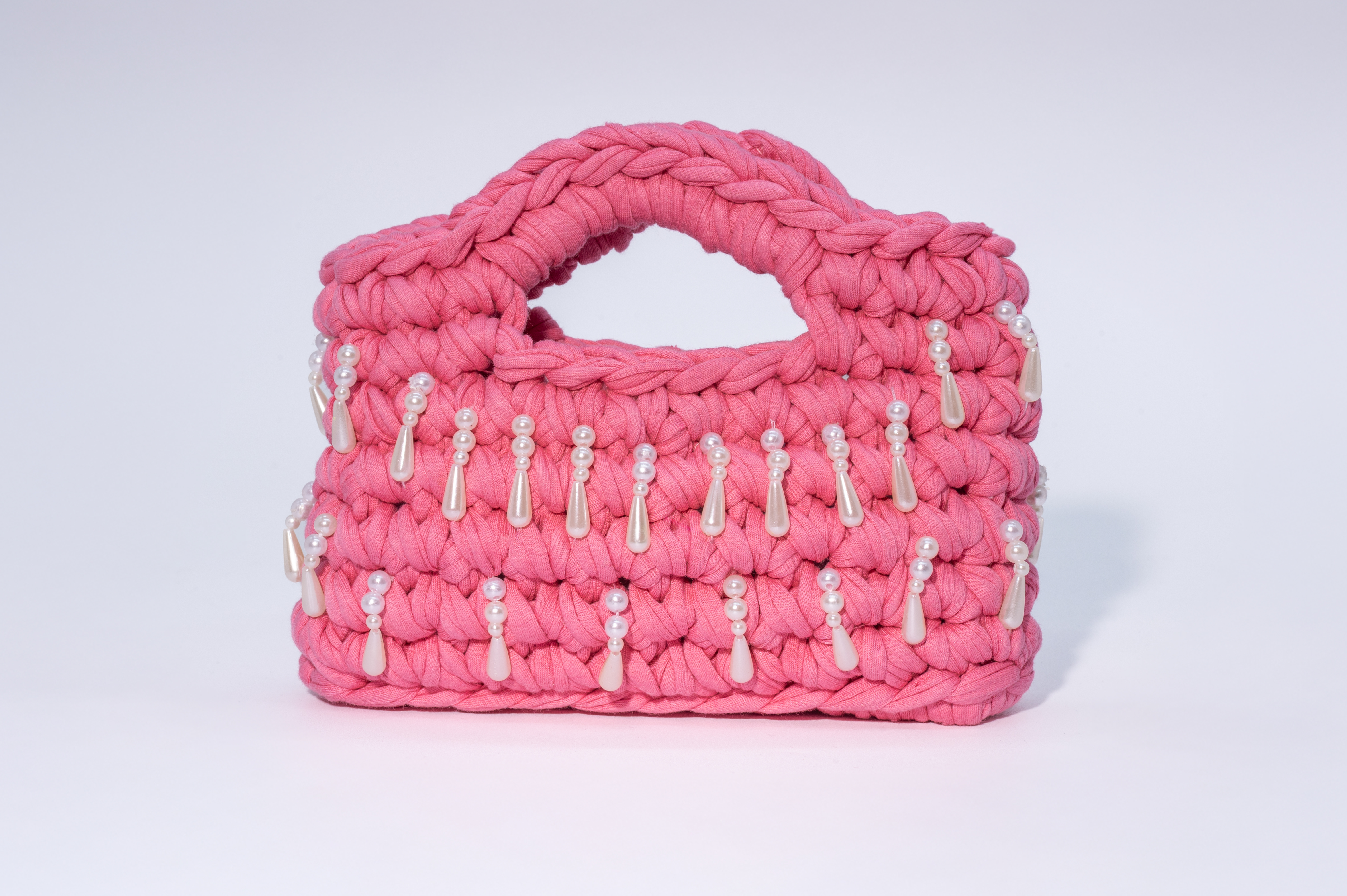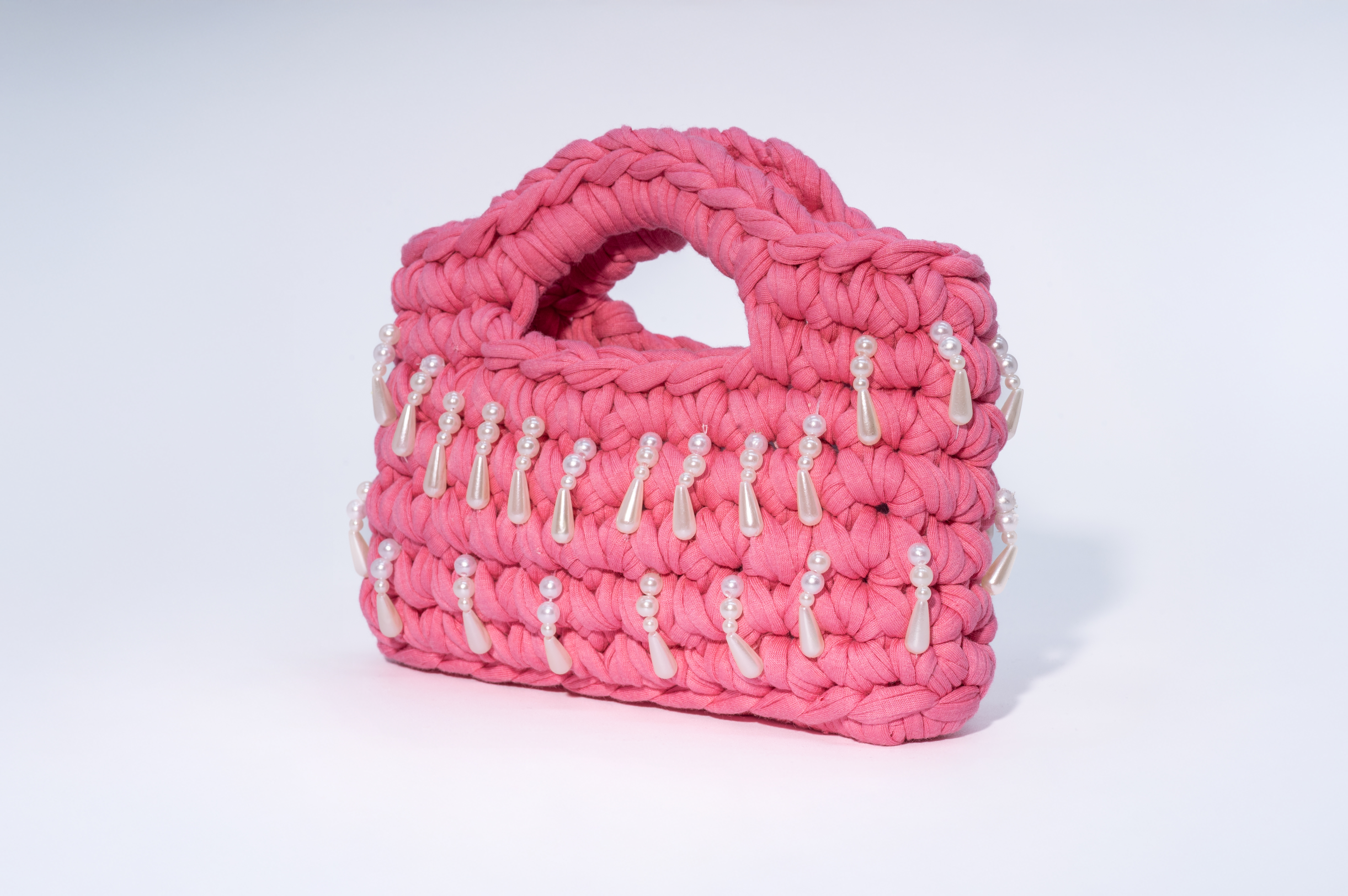 L’intreccio rosa acceso è impreziosito da applicazioni di perle e gocce madreperlate disposte su tutta la superficie, creando un effetto ricco di luce, movimento e femminilità . Il manico integrato garantisce una presa comoda e solida, mentre l’interno è foderato con tessuto, offrendo resistenza e praticità . La chiusura a clip metallica completa il design con un tocco di eleganza.