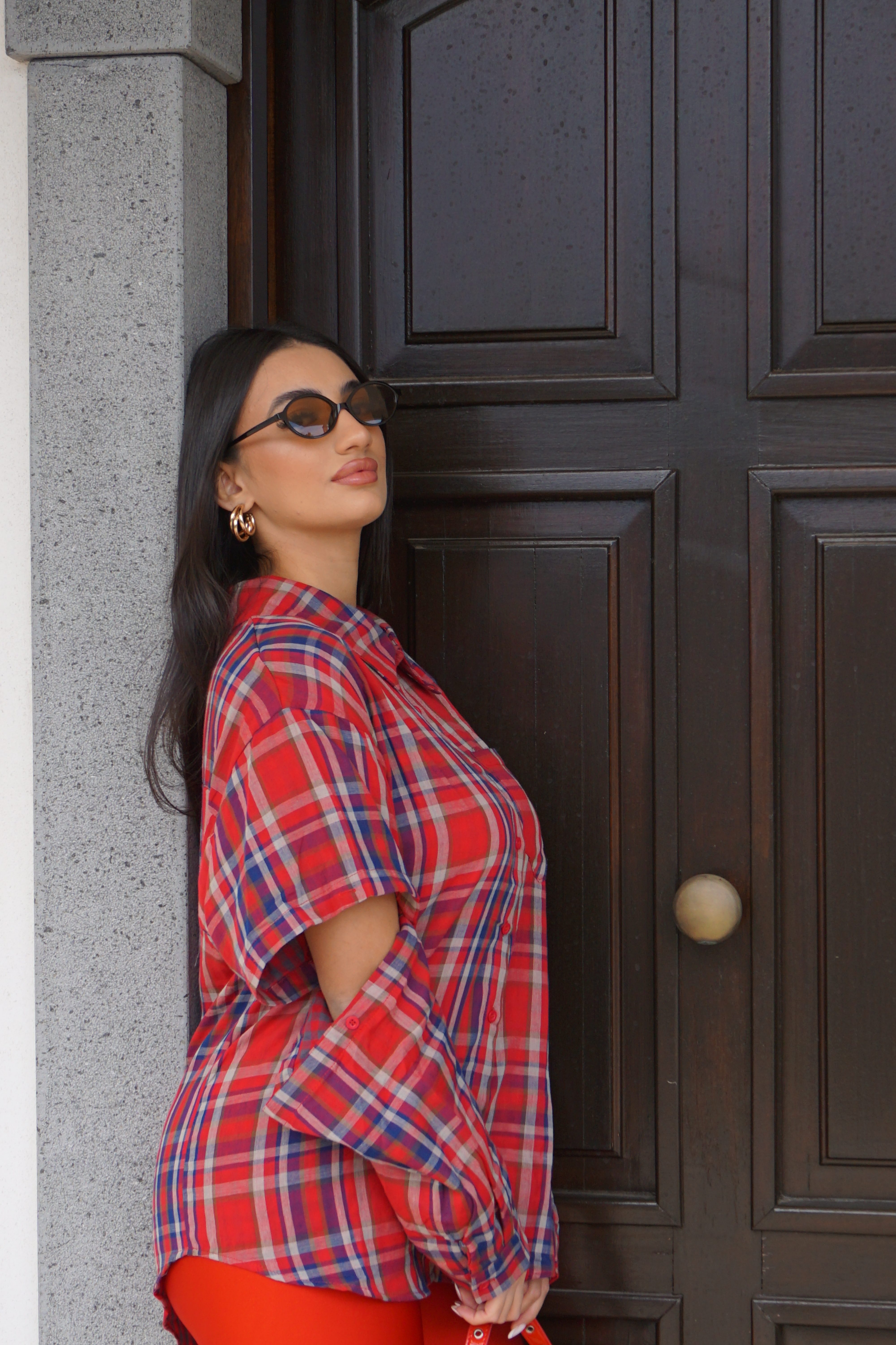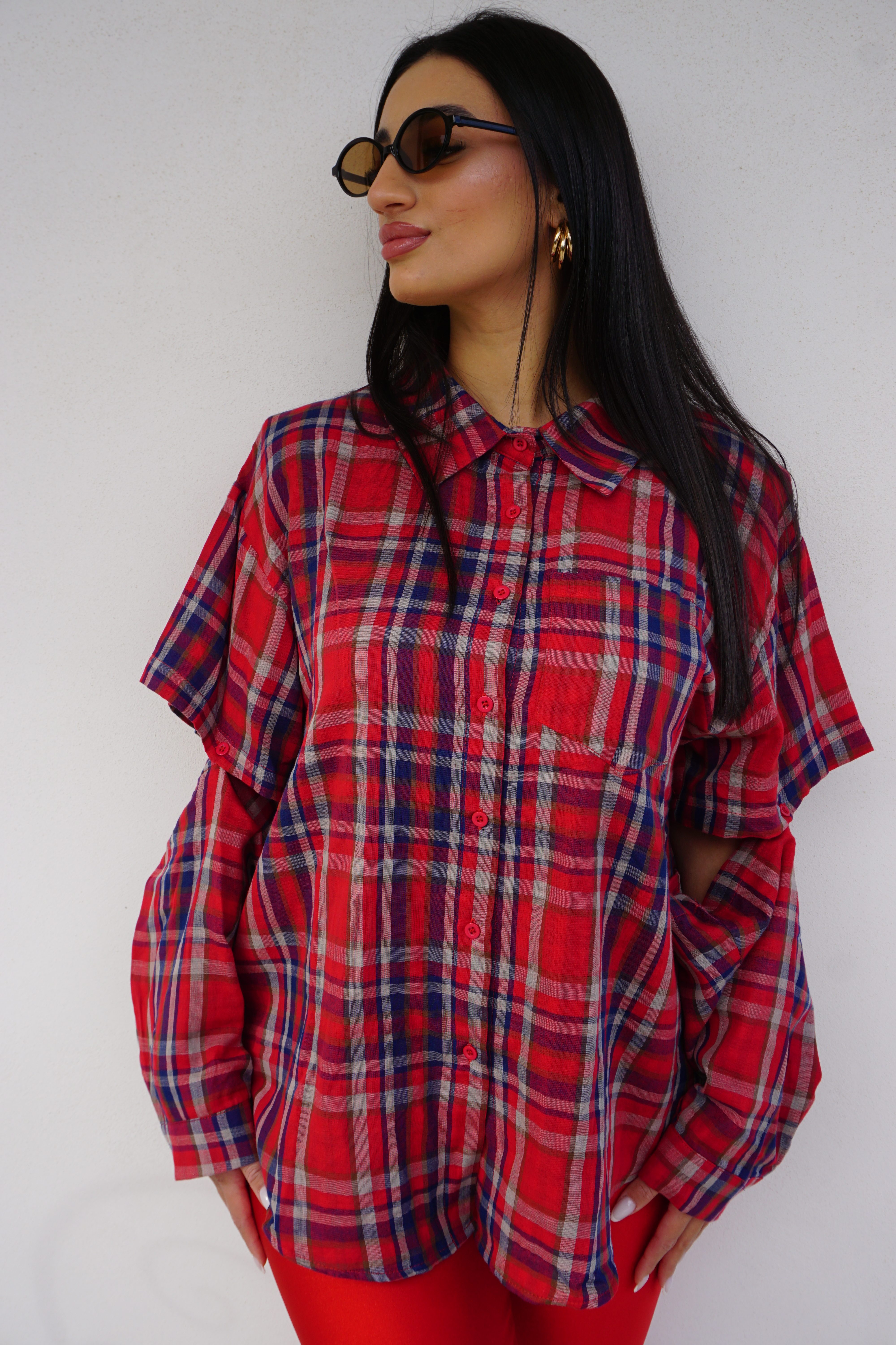 Camicia a quadri rossi con maniche staccabili tramite bottoni: un capo 2-in-1 versatile e originale, perfetto per look dinamici e contemporanei.