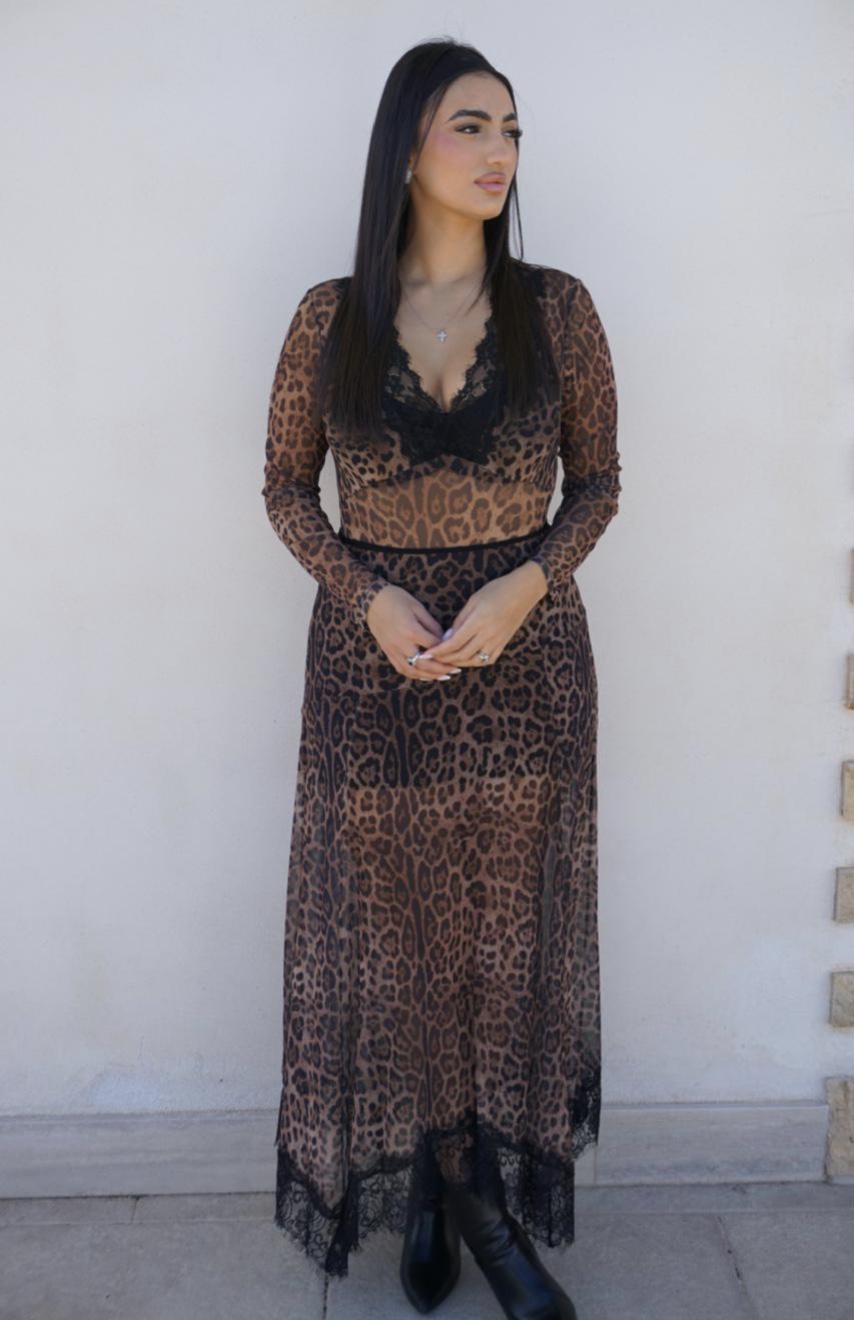 Questo completo coordinato unisce stile audace e comfort grazie al morbido tessuto in maglina, leggero e leggermente elasticizzato, perfetto per seguire le forme del corpo senza costrizioni. La maglietta a body valorizza la silhouette e presenta delicati inserti in pizzo, che aggiungono un tocco femminile e sofisticato. La gonna coordinata riprende il motivo maculato, creando un effetto armonioso e moderno. Il pizzo e il tessuto morbido si combinano per offrire un look chic ma anche confortevole, adatto sia a occasioni speciali sia a momenti in cui si desidera un outfit elegante ma pratico. Il completo è pensato per chi ama i dettagli raffinati senza rinunciare a stile e comodità .