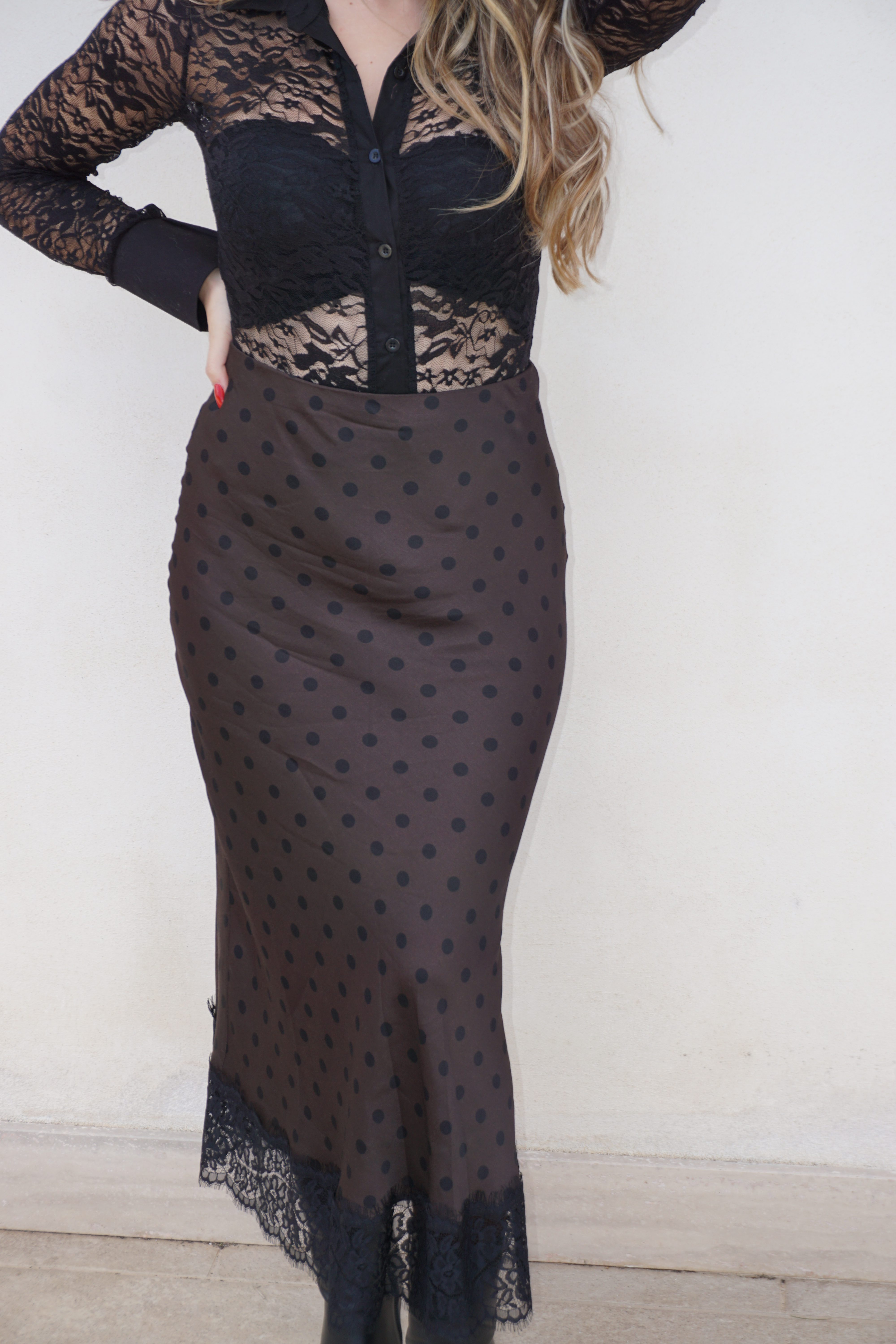 Gonna in seta marrone delicato con motivo a pois e pizzo raffinato lungo il bordo inferiore, elegante e femminile.