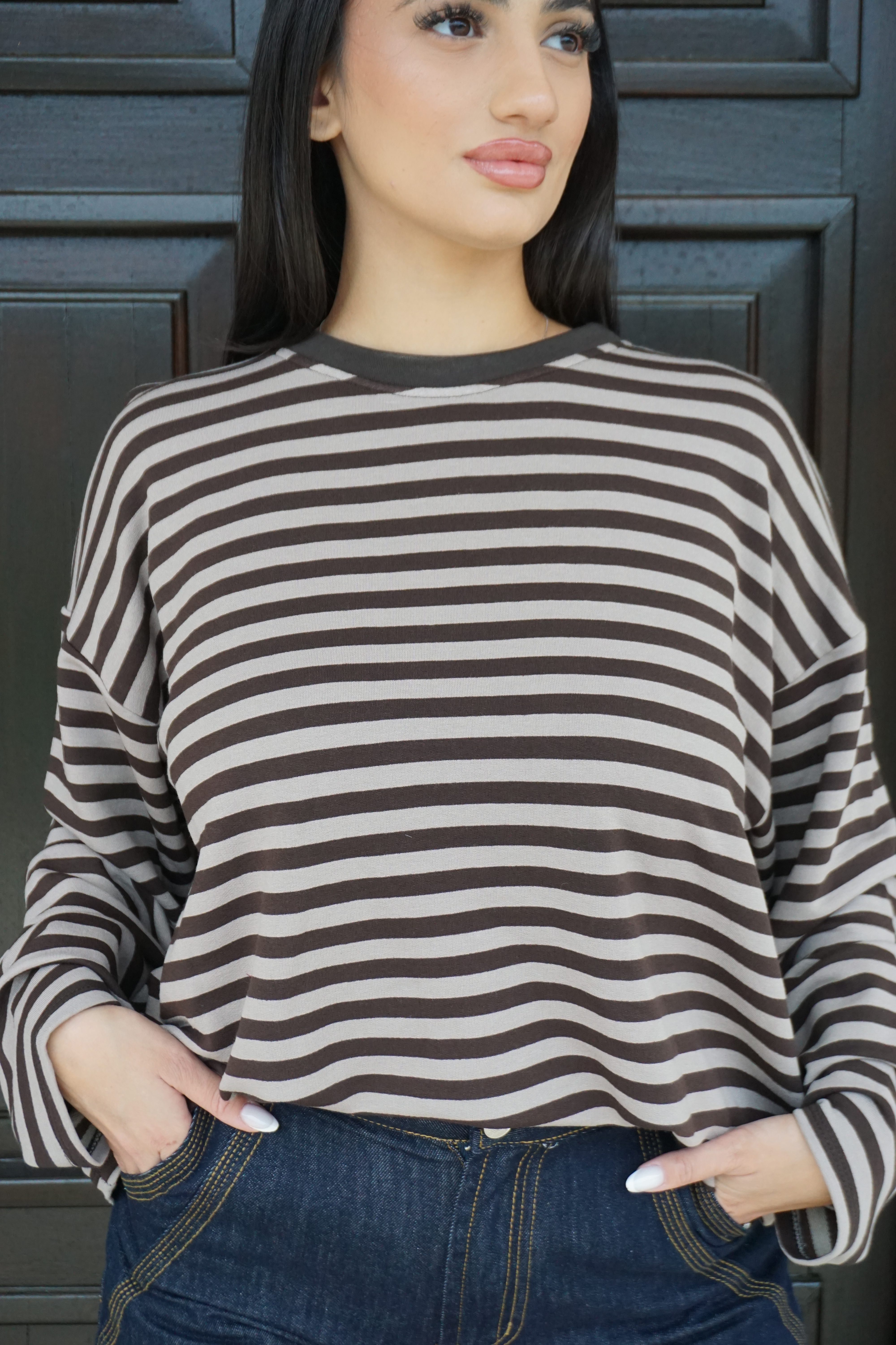 Maglia oversize a righe nei toni del caffè, morbida e confortevole. Perfetta per un look casual e rilassato, ideale per ogni stagione.