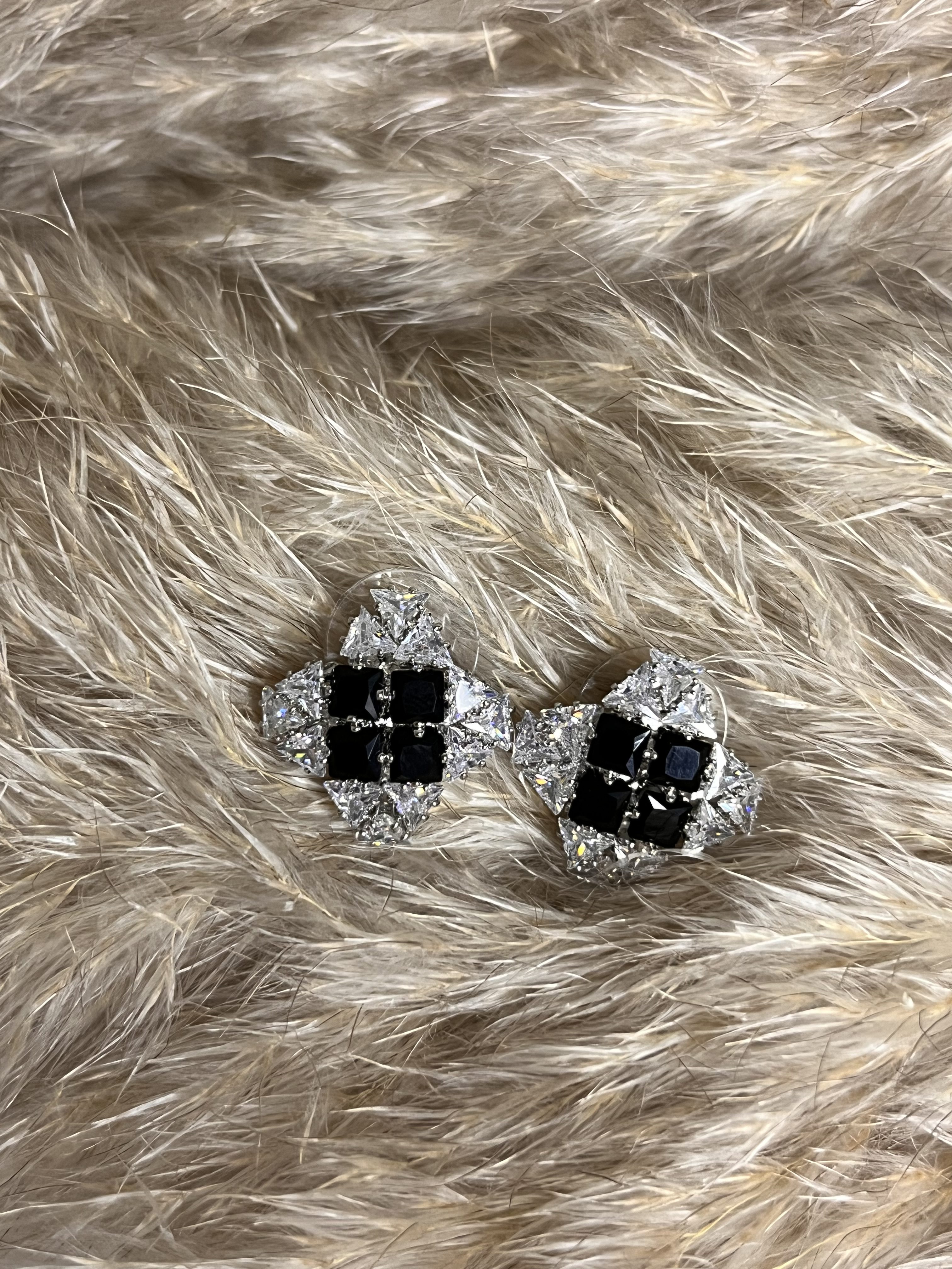 Questi gioielli statement sono un must-have per chi ama i contrasti decisi. La struttura geometrica è circondata da strass luminosi, che incorniciano quattro eleganti gemme nere squadrate al centro. L’effetto è quello di un lusso moderno e sofisticato.