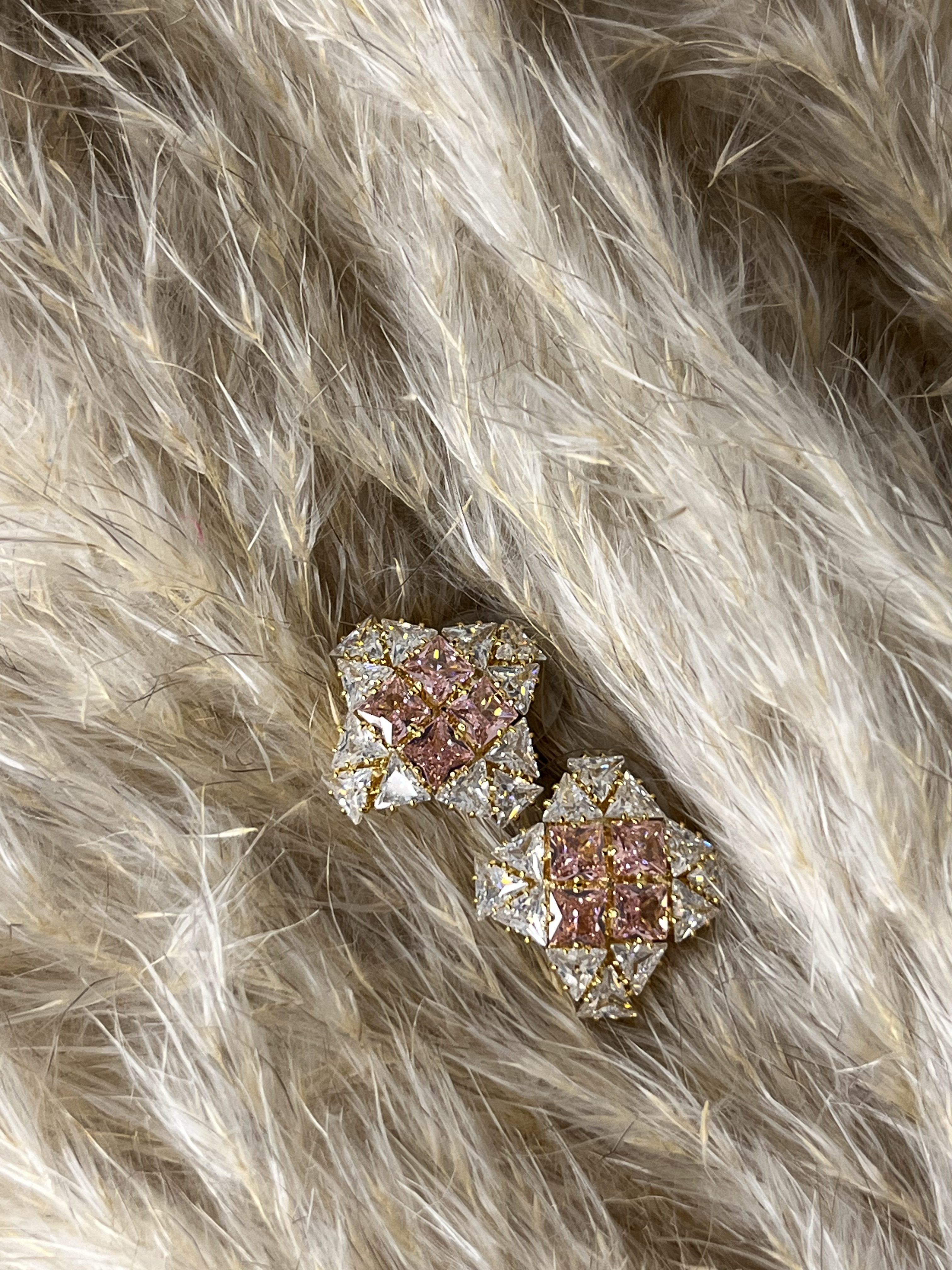 Questi gioielli statement sono un concentrato di lusso e splendore. La base a forma geometrica ricorda una piccola corona, interamente ricoperta da strass bianchi scintillanti che catturano ogni raggio di luce come veri diamanti. Al centro, quattro gemme rosa chiaro di taglio quadrato aggiungono un tocco di delicatezza regale e sofisticata.